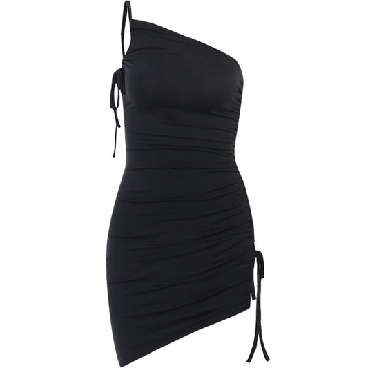 Summer Slim-fit Waist One-shoulder Pleated Design Sheath Dress