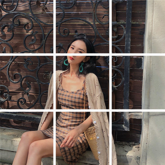 Bursting dress, women's dress, sling skirt, grid stitching, Chiffon Dress