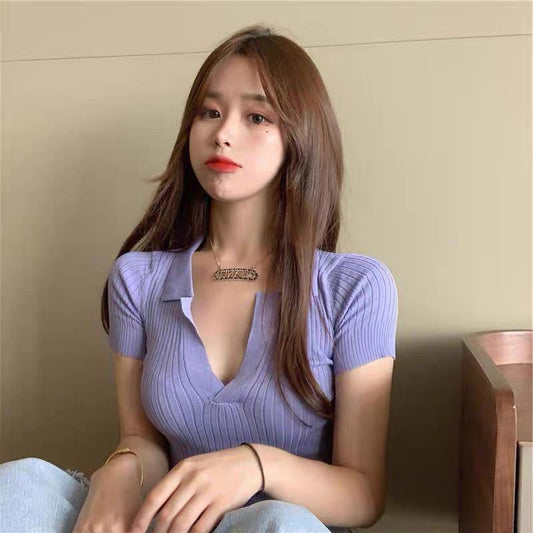 Fashion Ladies V-neck Knit Polo Shirt Short Sleeve